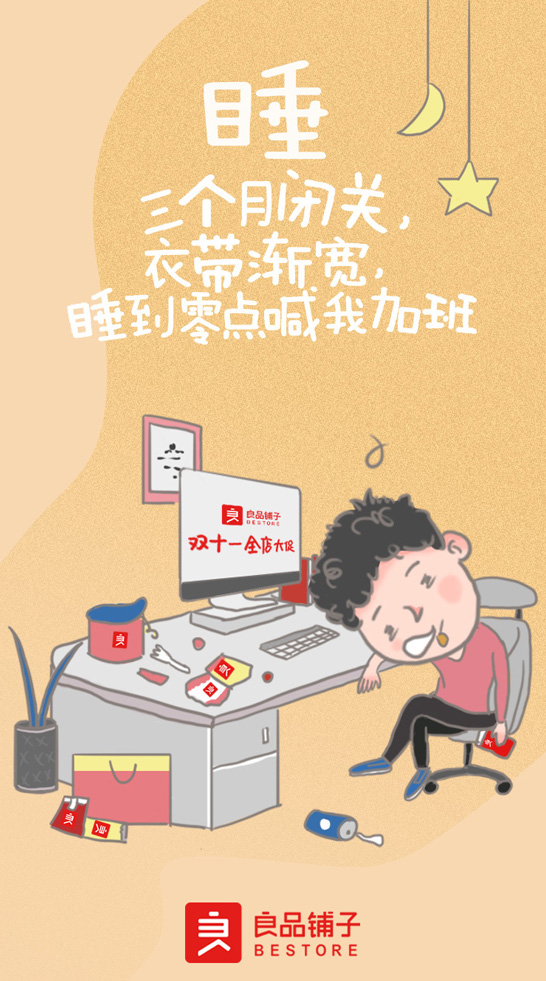 At 8:01 p.m. on November 10, 2018, while customers were finally confirming their shopping carts, e-commerce businessmen checking various settings of the platform, and brand operators waiting for the real-time data to make time points of supplies, the Official Weibo of BESTORE released a set of posters called “Show pity on e-commerce businessmen for a second”, which, by the deliberate copywriting and tender painting style, poked the pain points of countless e-commerce businessmen and quickly attracted the public’s attention.