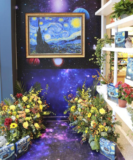 同時,休閑區(qū)的墻面布置成梵高星空圖,與線上熱賣的雙十一定制新品——梵高IP九味星球酥呼應(yīng),在店內(nèi)掃二維碼,就能進入電商平臺購買。如此線上線下結(jié)合,共同端出了一份歐式下午茶。